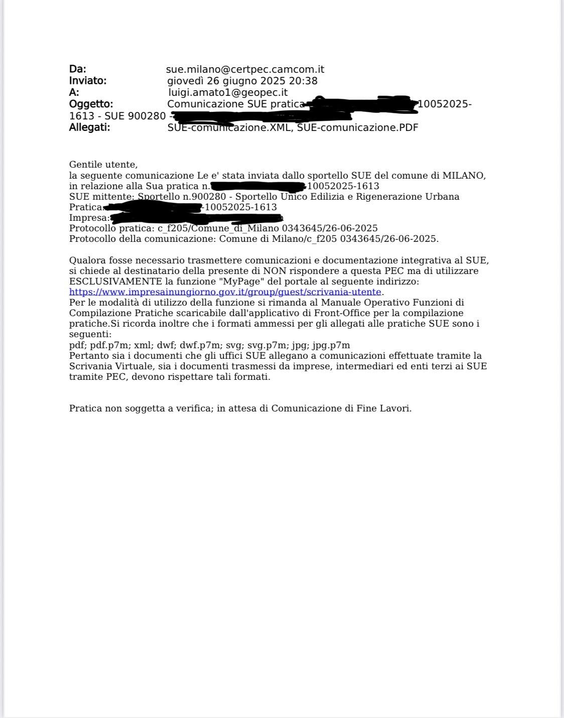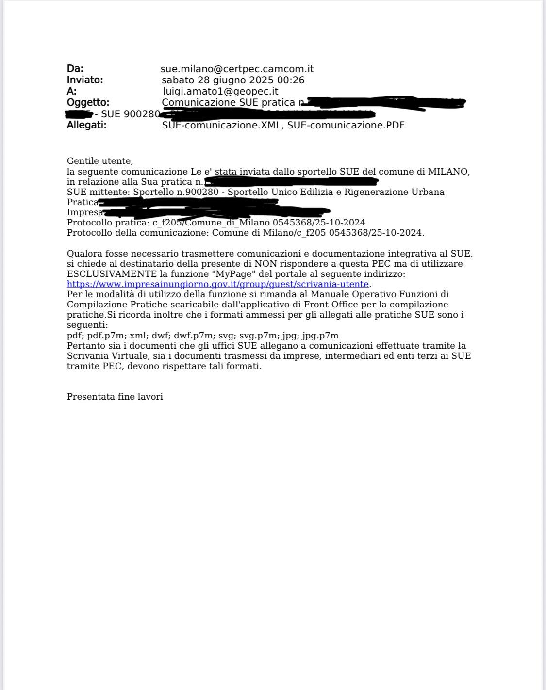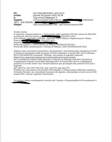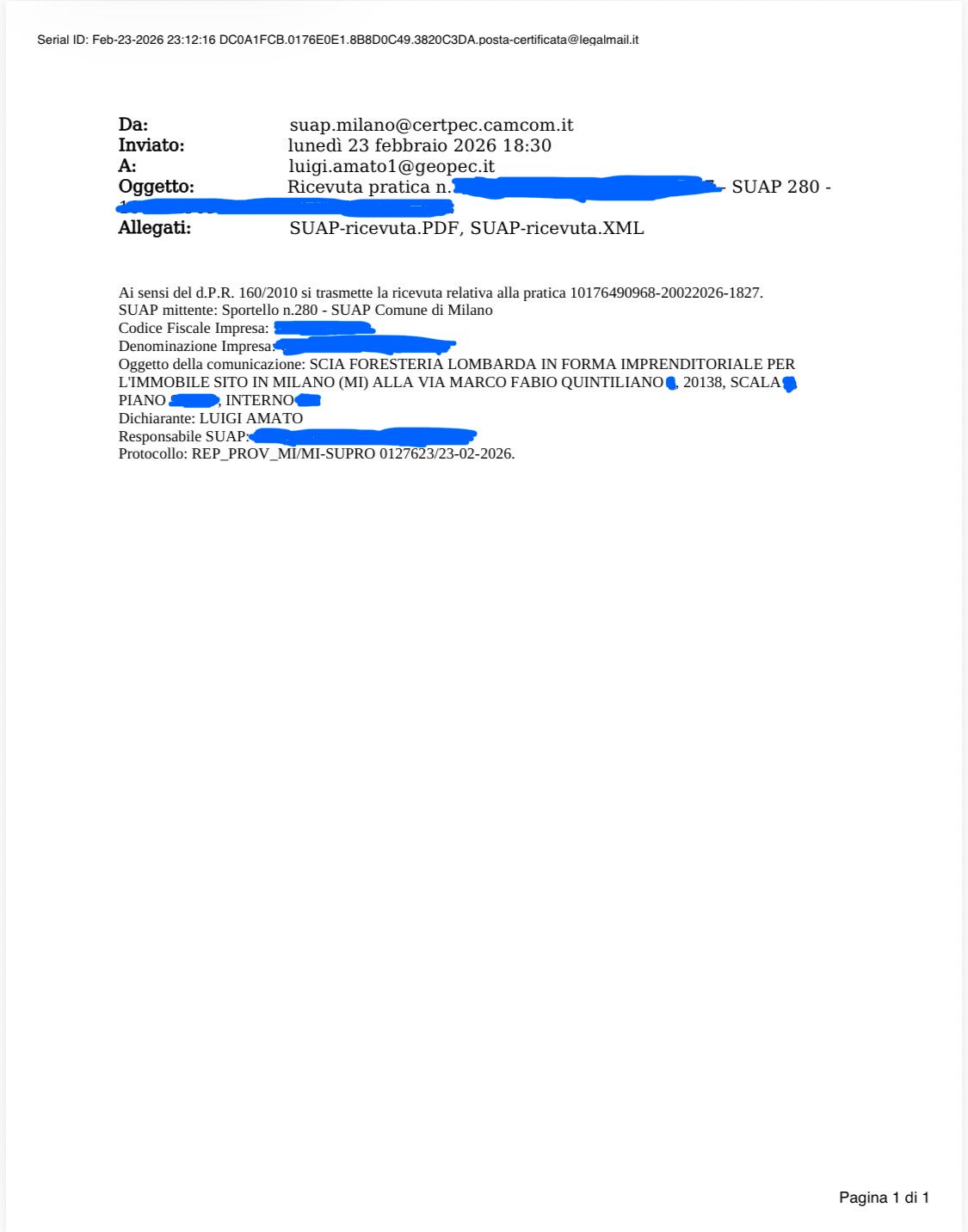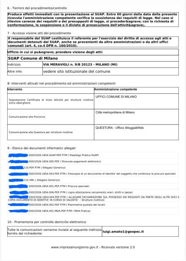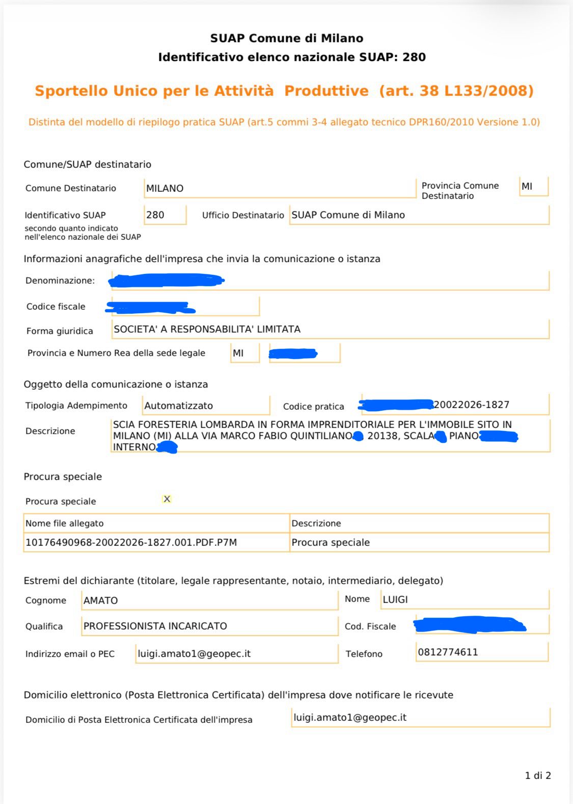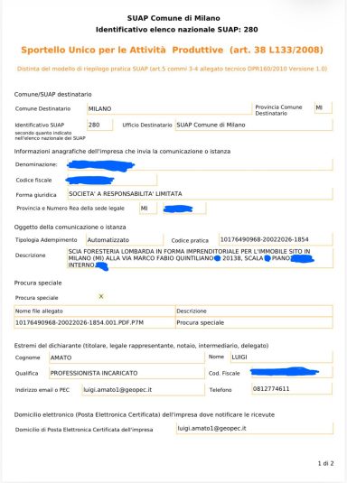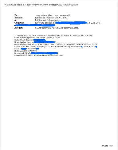 Trasmissione di n. 2 pratiche SCIA per Foresteria Lombarda al SUAP del Comune di Milano.